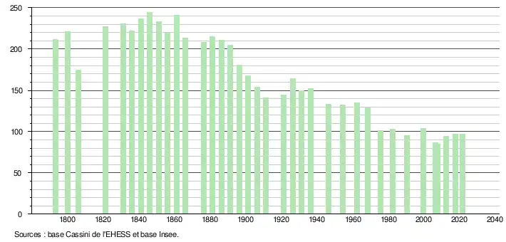 | L'évolution du nombre d'habitants est connue à travers les recensements de la population effectués dans la commune depuis 1793. Pour les communes de moins de 10 000 habitants, une enquête de recensement portant sur toute la population est réalisée tous les cinq ans, les populations légales des années intermédiaires étant quant à elles estimées par interpolation ou extrapolation[35]. Pour la commune, le premier recensement exhaustif entrant dans le cadre du nouveau dispositif a été réalisé en 2007[36]. En 2021, la commune comptait 97 habitants[Note 7], en diminution de 2,02 % par rapport à 2015 (Hautes-Pyrénées : +1,04 %, France hors Mayotte : +1,84 %). |