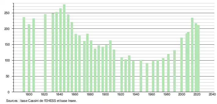 L'évolution du nombre d'habitants est connue à travers les recensements de la population effectués dans la commune depuis 1793. Pour les communes de moins de 10 000 habitants, une enquête de recensement portant sur toute la population est réalisée tous les cinq ans, les populations légales des années intermédiaires étant quant à elles estimées par interpolation ou extrapolation[17]. Pour la commune, le premier recensement exhaustif entrant dans le cadre du nouveau dispositif a été réalisé en 2008[18].