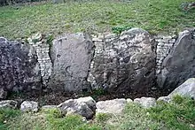 Les dalles de couverture, qui subsistaient encore au XVIIIe siècle, ont été réutilisées comme matériaux de construction au XIXe siècle[4]. Selon Mortillet, une table de couverture était encore en position lors des fouilles de 1889 et une seconde (2,40 m de long sur 2 m de large) renversée à l'intérieur de la chambre. À l'origine, la surface des tables devaient affleurer le sol, celui-ci étant désormais exhaussé par les déblais des fouilles[1].