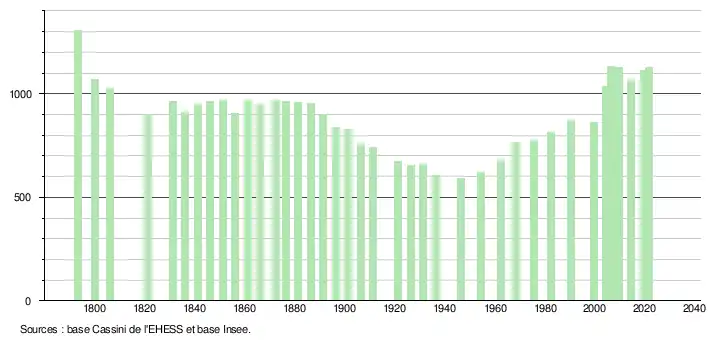 | L'évolution du nombre d'habitants est connue à travers les recensements de la population effectués dans la commune depuis 1793. Pour les communes de moins de 10 000 habitants, une enquête de recensement portant sur toute la population est réalisée tous les cinq ans, les populations légales des années intermédiaires étant quant à elles estimées par interpolation ou extrapolation[24]. Pour la commune, le premier recensement exhaustif entrant dans le cadre du nouveau dispositif a été réalisé en 2004[25]. En 2021, la commune comptait 1 127 habitants[Note 4], en augmentation de 6,32 % par rapport à 2015 (Landes : +4,9 %, France hors Mayotte : +1,84 %). |