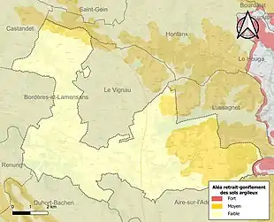 Le retrait-gonflement des sols argileux est susceptible d'engendrer des dommages importants aux bâtiments en cas d’alternance de périodes de sécheresse et de pluie. 24,2 % de la superficie communale est en aléa moyen ou fort (19,2 % au niveau départemental et 48,5 % au niveau national). Sur les 533 bâtiments dénombrés sur la commune en 2019, 16 sont en aléa moyen ou fort, soit 3 %, à comparer aux 17 % au niveau départemental et 54 % au niveau national. Une cartographie de l'exposition du territoire national au retrait gonflement des sols argileux est disponible sur le site du BRGM[21],[Carte 2].