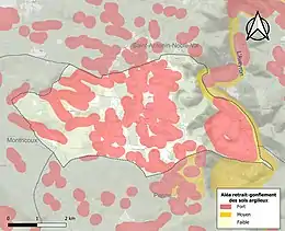 Le retrait-gonflement des sols argileux est susceptible d'engendrer des dommages importants aux bâtiments en cas d’alternance de périodes de sécheresse et de pluie. 59,4 % de la superficie communale est en aléa moyen ou fort (92 % au niveau départemental et 48,5 % au niveau national). Sur les 181 bâtiments dénombrés sur la commune en 2019, 158 sont en aléa moyen ou fort, soit 87 %, à comparer aux 96 % au niveau départemental et 54 % au niveau national. Une cartographie de l'exposition du territoire national au retrait gonflement des sols argileux est disponible sur le site du BRGM[34],[Carte 2].