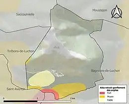 Le retrait-gonflement des sols argileux est susceptible d'engendrer des dommages importants aux bâtiments en cas d’alternance de périodes de sécheresse et de pluie. 8,9 % de la superficie communale est en aléa moyen ou fort (88,8 % au niveau départemental et 48,5 % au niveau national). Sur les 31 bâtiments dénombrés sur la commune en 2019, 3 sont en aléa moyen ou fort, soit 10 %, à comparer aux 98 % au niveau départemental et 54 % au niveau national. Une cartographie de l'exposition du territoire national au retrait gonflement des sols argileux est disponible sur le site du BRGM[31],[Carte 3].