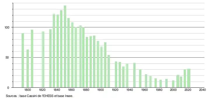 | L'évolution du nombre d'habitants est connue à travers les recensements de la population effectués dans la commune depuis 1793. Pour les communes de moins de 10 000 habitants, une enquête de recensement portant sur toute la population est réalisée tous les cinq ans, les populations légales des années intermédiaires étant quant à elles estimées par interpolation ou extrapolation[35]. Pour la commune, le premier recensement exhaustif entrant dans le cadre du nouveau dispositif a été réalisé en 2005[36]. En 2021, la commune comptait 31 habitants[Note 8], en augmentation de 3,33 % par rapport à 2015 (Hautes-Pyrénées : +1,04 %, France hors Mayotte : +1,84 %). |