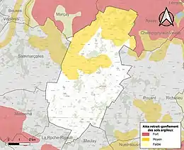 Les mouvements de terrains susceptibles de se produire sur la commune sont des affaissements et effondrements liés aux cavités souterraines (hors mines) et des tassements différentiels[19]. Afin de mieux appréhender le risque d’affaissement de terrain, un inventaire national permet de localiser les éventuelles cavités souterraines sur la commune[20]. Le retrait-gonflement des sols argileux est susceptible d'engendrer des dommages importants aux bâtiments en cas d’alternance de périodes de sécheresse et de pluie[21]. 35,2 % de la superficie communale est en aléa moyen ou fort (79,5 % au niveau départemental et 48,5 % au niveau national)[Carte 2]. Depuis le , en application de la loi ÉLAN, différentes contraintes s'imposent aux vendeurs, maîtres d'ouvrages ou constructeurs de biens situés dans une zone classée en aléa moyen ou fort[Note 2],[22].