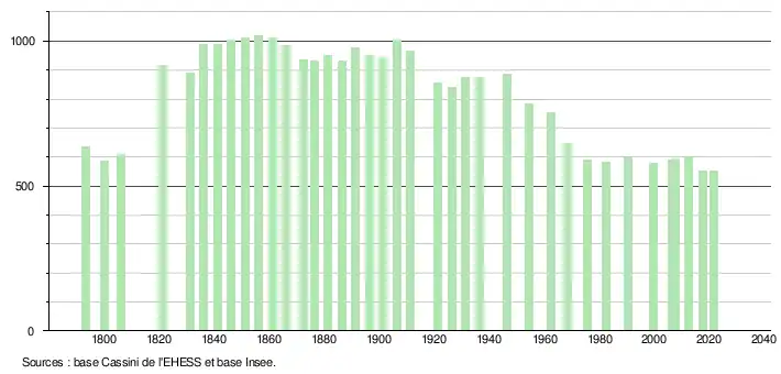 L'évolution du nombre d'habitants est connue à travers les recensements de la population effectués dans la commune depuis 1793. Pour les communes de moins de 10 000 habitants, une enquête de recensement portant sur toute la population est réalisée tous les cinq ans, les populations légales des années intermédiaires étant quant à elles estimées par interpolation ou extrapolation[26]. Pour la commune, le premier recensement exhaustif entrant dans le cadre du nouveau dispositif a été réalisé en 2007[27].