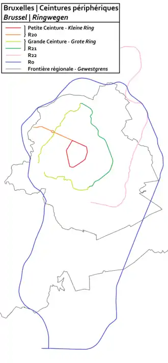 Outre quatre ceintures routières, l'agglomération bruxelloise possède également plusieurs rocades dans d'autres modes de transport : les chemins de fer (ligne 26 à l'est et ligne 28 à l'ouest), le métro (ligne 2 et 6), le tram (en ce qui concerne la Petite ceinture : ligne 51, à l'ouest, donnant correspondance avec le métro de ceinture ; d'autres lignes desservent les ceintures plus extérieures, voir ci-dessous) et les voiries cyclo-pédestres.