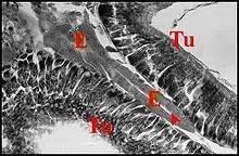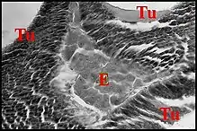 Comme celles des Araignées américaines du genre Mastophora, la femelle de Celaenia excavata possède un tissu particulier siégeant dans l'abdomen. Découvert en 1998, ce "tissu folliculaire endocrinoïde" se compose de cellules particulières réunies en îlots logés entre les glandes séricigènes tubuliformes, qui tendent à les comprimer (Fig.1,2)[2]. Ils montrent des cavités centrales très étroites que peut limiter une seule assise cellulaire (Fig.1).