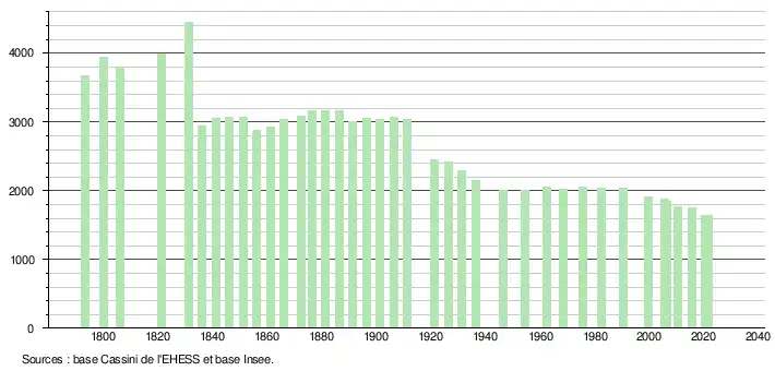 L'évolution du nombre d'habitants est connue à travers les recensements de la population effectués dans la commune depuis 1793. Pour les communes de moins de 10 000 habitants, une enquête de recensement portant sur toute la population est réalisée tous les cinq ans, les populations légales des années intermédiaires étant quant à elles estimées par interpolation ou extrapolation[29]. Pour la commune, le premier recensement exhaustif entrant dans le cadre du nouveau dispositif a été réalisé en 2005[30].