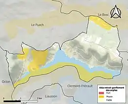 Le retrait-gonflement des sols argileux est susceptible d'engendrer des dommages importants aux bâtiments en cas d’alternance de périodes de sécheresse et de pluie. 26,5 % de la superficie communale est en aléa moyen ou fort (59,3 % au niveau départemental et 48,5 % au niveau national). Sur les 15 bâtiments dénombrés sur la commune en 2019, 1 sont en aléa moyen ou fort, soit 7 %, à comparer aux 85 % au niveau départemental et 54 % au niveau national. Une cartographie de l'exposition du territoire national au retrait gonflement des sols argileux est disponible sur le site du BRGM[25],[Carte 2].