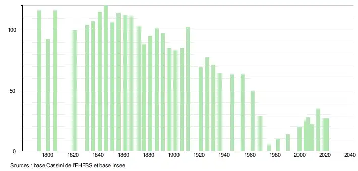 L'évolution du nombre d'habitants est connue à travers les recensements de la population effectués dans la commune depuis 1793. Pour les communes de moins de 10 000 habitants, une enquête de recensement portant sur toute la population est réalisée tous les cinq ans, les populations légales des années intermédiaires étant quant à elles estimées par interpolation ou extrapolation[34]. Pour la commune, le premier recensement exhaustif entrant dans le cadre du nouveau dispositif a été réalisé en 2004[35].