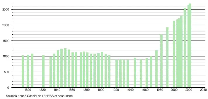 L'évolution du nombre d'habitants est connue à travers les recensements de la population effectués dans la commune depuis 1793. Pour les communes de moins de 10 000 habitants, une enquête de recensement portant sur toute la population est réalisée tous les cinq ans, les populations légales des années intermédiaires étant quant à elles estimées par interpolation ou extrapolation[19]. Pour la commune, le premier recensement exhaustif entrant dans le cadre du nouveau dispositif a été réalisé en 2004[20].