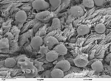 Cellules club et cellules ciliées au sein d'un épithélium bronchique, au microscope électronique à balayage