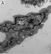Une cellule interstitielle de Cajal est un type de cellule présent dans le tube digestif d'origine mésenchymateuse. Les cellules interstitielles de Cajal myentériques ressemblent à des cellules musculaires, mais ne sont pas contractiles. Elles possèdent une activité d'auto-excitation (pacemaker) qui se propage aux autres cellules par des jonctions communicantes (jonctions GAP). Cette activité électrique permet de rapprocher les cellules musculaires lisses du tube digestif du seuil de déclenchement du potentieĺ d'action. Ainsi, elles facilitent la contraction du tube digestif (péristaltisme) et l'avancée du chyme dans le tube qui a lieu à la suite d'une stimulation par le nerf vague puis par les sécrétions gastriques.