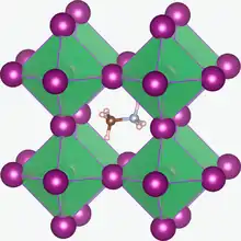 Les composés de formule générale ABX3, où A et B sont des cations et X un anion, produisent des pérovskites lorsque le rayon ionique de A est compris entre 160 et 250 pm[12]. Les halogénures de plomb méthylammonium CH3NH3PbX3 sont parmi les pérovskites photovoltaïques les plus étudiées, notamment le triiodure de plomb méthylammonium CH3NH3PbI3, dans lequel le cation A est le méthylammonium CH3NH3+, le cation B est le plomb Pb2+ et l'halogénure X est l'anion iodure I−, ou encore des halogénures mixtes tels que CH3NH3PbI3−xClx. Ces matériaux présentent une largeur de bande interdite de l'ordre de 1,55 à 2,3 eV selon les halogènes qu'ils contiennent. Les trihalogénures de plomb formamidinium HC(NH2)2PbX3 présentent également un intérêt photovoltaïque, avec une largeur de bande interdite de l'ordre de 1,48 à 2,2 eV ; la largeur de bande interdite la plus faible de ces composés étant plus proche de l'optimum pour les cellules à jonction p-n que la largeur de bande interdite des composés à méthylammonium, cela devrait permettre de meilleurs rendements énergétiques[13].
