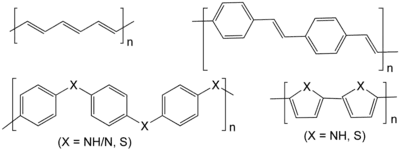 D'autres couples p / n sont étudiés, certains à base de para-phénylène-vinylène (PPV) comme donneurs, tels que MEH-PPV / PCBM[5] ou MDMO-PPV / PCBM[6], ou à la fois comme donneurs et comme accepteurs, tels que MDMO-PPV / PCNEPV[7],[8]. Plus récemment, des copolymères à faible largeur de bande interdite font leur apparition dans les cellules solaires organiques de haute performance, comme le PCDTBT / PCBM[9].