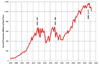 Courbe de production de charbon aux États-Unis, qui donne une idée de ce qu’a été la courbe de production de « produits issus de la combustion du charbon (gaz, cendres et mâchefers)
