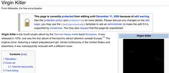 En , l'Internet Watch Foundation (IWF) ajoute l'article en anglais Virgin Killer, portant sur un disque du groupe Scorpions, sur sa liste noire à cause de la pochette du disque qui montre une fillette nue de face, ce qui contreviendrait aux lois sur la pédopornographie. L'image est catégorisée au plus faible niveau possible : « pose érotique sans activité à caractère sexuel[trad 6] »[60]. En conséquence, les internautes britanniques utilisant les services des FAI majeurs du Royaume-Uni sont interdits de consultation de l'article[60],[61],[62] et une partie significative des internautes du Royaume-Uni est interdite de modifier Wikipédia à cause de la méthode utilisée pour bloquer le contenu sensible. À la suite de discussions, de représentations par la Wikimedia Foundation (qui héberge Wikipédia)[63] et de plaintes du public[64], l'IWF annule sa décision trois jours plus tard.