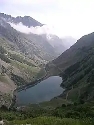 - le réservoir supérieur de Chiotas, à l'altitude de 1 978 m, retenu par un barrage voûte-poids de 130 m de hauteur, a une capacité de 30,2 Mm3, dont 27,3 Mm3 de capacité utile, et un bassin versant de 11,6 km2 ; sa profondeur maximale est de 118 m[4]. Une digue de col de 30 m de haut et de 70 m de long, dit Colle Laura, a été construite pour fermer la retenue vers l'est ; elle est équipée d'un déversoir d'une capacité de 240 m3/s.