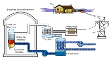 L'énergie d'une centrale nucléaire provient de la fission de noyaux d'atomes lourds. Celle-ci dégage de la chaleur, qui sert dans un premier temps à vaporiser de l'eau, comme dans toute centrale électrique thermique conventionnelle, puis la vapeur d'eau produite entraîne en rotation une turbine accouplée à un alternateur qui produit à son tour de l'électricité. C'est la principale application de l'énergie nucléaire dans le domaine civil.