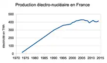 La production d'électricité d'origine nucléaire a été multipliée par trente entre 1973 et 2006, passant de 14,8 TWh à 450,2 TWh[68]. Celle-ci diminue toutefois de manière continue entre 2006 et 2010 alors que le nombre de centrales en activité n'a pas changé. Ceci s'explique par une baisse du coefficient de production. Cette diminution est surtout imputable à l'allongement des arrêts de tranche et à des mouvements de personnel induisant une baisse du coefficient de production[68].