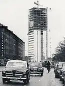 La tour Pylon, qui est constituée d'un squelette en acier, est au moment de son inauguration le premier immeuble de Suède, et l'immeuble le plus haut d'Europe, basé sur cette technique de construction. Pour renforcer l'impression de hauteur, le bâtiment est plus étroit au sommet qu'à la base. Les deux petits côtés sont recouverts de tôle ondulée, les cages d'escalier étant marquées par des colonnes de fenêtres. Les grands côtés sont recouverts de verre teinté, un type de façade encore inhabituel à l'époque.