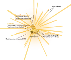 Dans les cellules animales, le centre organisateur des microtubules est composé d'un centrosome, organite non membrané qui se compose d'une paire de centrioles, et d'un nuage de matériel amorphe appelé matériel péricentriolaire[1]. Un centriole est composé de neuf triplets de microtubules (avec treize protofilaments entre chaque microtubule), formant la paroi d'un cylindre. C'est à partir de cet ensemble que s'effectue la nucléation des microtubules grâce à la présence, à sa surface, d'anneaux de tubuline γ, homologue de la protéine ARP pour l'actine. Il n'existe pas de continuité entre les centrioles et les microtubules cytosoliques, qui polymérisent autour des anneaux de tubuline γ. Les microtubules polymérisent à partir de ce centre organisateur qui représente le point de ralliement des microtubules, lui donnant alors un rôle primordial dans le trafic intracellulaire. Le centre organisateur des microtubules a un rôle dans l'orientation des cellules et est à l'origine des cils et des flagelles.