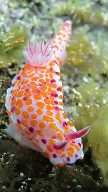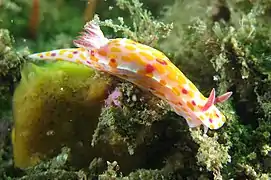 Le corps est allongé et oblong, arrondi à l'avant et en pointe en arrière avec le dos légèrement convexe. Le manteau est plus petit que le pied. Il est assez lisse et régulier, d'une couleur rose[1] lilas pâle ou violacé[2]. Il présente une rangée centrale de grandes taches oblongues orange vif[2] ou de nombreuses petites taches orange parmi lesquelles se trouvent quelques points rouge[1] et, à l'occasion, quelques taches, latérales proches de la marge, de couleur crème pâle ou blanc jaunâtre[2]. La marge du manteau est blanche[1]. Le pied est plus pâle que le manteau avec les côtés et les extrémités présentant une double rangée irrégulière de taches orange vif arrondies, considérablement plus longues que celles du manteau. Le dessous du pied est de couleur chair pâle. Les spicules du manteau manquent apparemment[2].