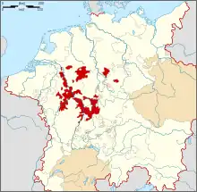 ![]() | Palatinat du Rhin | Fondé en 1085. Électorat en 1356. Union avec la Bavière en 1777. Rive gauche du Rhin à la république cisrhénane en 1797, puis à la France en 1801. Rive droite à Bade en 1806. |
