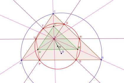 Les droites (RQ), (ST) et (PU) sont antiparallèles aux côtés d'un triangle. Les segments sont de même longueur et leurs milieux A’, B’ et C’ situés sur les symédianes forment un triangle A’B’C’ homothétique de ABC dans une homothétie de centre L.