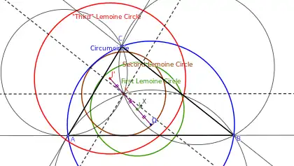 En géométrie du triangle, les cercles de Lemoine sont des cercles définis par rapport à un triangle, portant le nom d'Émile Lemoine, qui sont des cas particuliers de cercles de Tucker[1]. Les deux premiers ont été étudiés par Lemoine lui-même, et le troisième a été découvert par Jean-Luc Ehrmann en 2011[2].