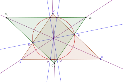 Ils forment un triangle A’1B’1C’1 symétrique de ABC dans une symétrie de centre L. Par la même symétrie, les triangles P'R'T' et Q'S'U' sont symétriques.