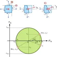 Dans le plan (σ, τ), la représentation des solutions des équations τ2 + (σ - Ci )2 = Ri2 sont des cercles de centre Ci et de rayon Ri . Donc, l'ensemble des valeurs (σ, τ) pour toutes les orientations possibles de est une surface délimitée par trois cercles.