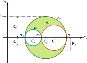 On remarque que tous les cercles sont tangents deux à deux, et que le plus grand cercle est le cercle de rayon Ry, donc correspondant au plan (x, z ). La cission maximale vaut donc
