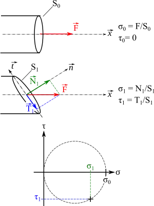 Considérons une section inclinée d'un angle par rapport à la section initiale ; elle a une aire . Si l'on projette la force sur la normale à cette section, on obtient une force normale de module . La contrainte normale σ1 vaut alors: