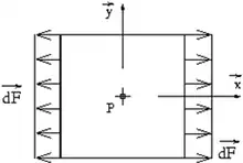 Considérons un point P d'un solide ayant un état de contrainte plane. Il s'agit typiquement d'un point de la surface d'une pièce où aucune force extérieure ne s'applique : pas de pression hydrostatique, pas de contact avec une autre pièce (surface libre).