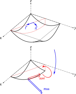 Si l'on fait une coupe selon un plan faisant un angle α autour de l'axe z, on voit que cette face subit un moment fléchissant, qui courbe la face, et un moment de torsion qui l'incline. En écrivant l'équilibre de cette portion de plaque, on voit que le moment s'exerçant sur la face de coupe peut se décomposer en un vecteur moment normal mnn , qui crée la torsion (la section tourne dans le plan), et un vecteur moment tangentiel mnt qui crée la flexion (la plaque se courbe). On se retrouve dans une situation similaire à celle des contraintes normales et tangentielles.