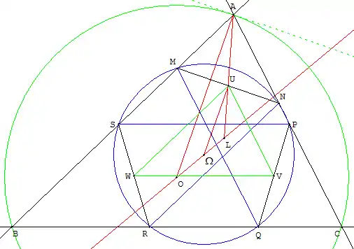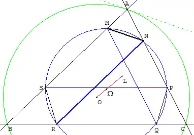 Les milieux forment un triangle UVW se déduisant de ABC dans une homothétie de centre L de rapport k. Dans cette homothétie, le point O a pour image Ω avec LΩ/LO = |k|. Ce point Ω est le centre du cercle circonscrit à UVW. La droite (UΩ) parallèle à (OA) est perpendiculaire à (MN), c'est la médiatrice de [MN]. De même (VΩ) est la médiatrice de [PQ]. Ω est bien le centre du cercle (T).