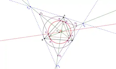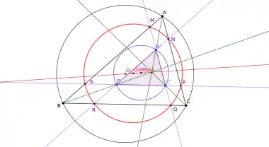 - son cercle d'Apollonius (le cercle tangent intérieurement aux trois cercles exinscrits à ABC, pour , avec r le rayon du cercle inscrit dans ABC et p son demi-périmètre)