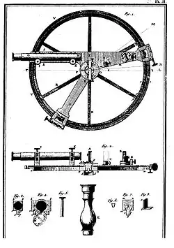 - le corps de l'instrument, en laiton moulé d'une seule pièce, a un diamètre intérieur de 26 cm, un limbe de 13 mm de largeur divisé en 720° ;