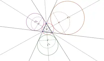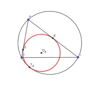 Soit la composée de l'inversion de pôle A et de rapport , et de la réflexion par rapport à la bissectrice en A. échange les sommets A et A et échange le centre du cercle inscrit avec le centre du cercle A-exinscrit. Puisque l'inversion et la réflexion sont bijectives et conservent les points de contact, fait de même. Ainsi, l'image du cercle A-exinscrit sous est un cercle tangent intérieurement aux côtés AB, AC et au cercle circonscrit de ABC, c'est un cercle A-mixtilinéaire inscrit.