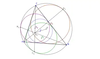 - Les perpendiculaires à et passant par les points et respectivement se croisent en un point noté , qui est le centre du cercle mixtilinéaire.