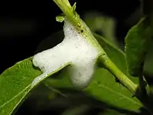 Après s’être libérée de l'exuvie nymphale, les taches apparaissent rosâtres et/ou blanchâtres. En perforant la plante, la larve aspire la sève pour en extraire les éléments nutritifs. Une fois filtrée par des glandes salivaires et excrétée par l’anus, la larve forme un enrobage d’exsudat mousseux que l’on appelle un amas spumeux. La larve produit l’amas spumeux au printemps, il agit comme un répulsif pour se protéger des prédateurs, des parasites et assurer l’isolation thermique par le contrôle de la température et l’humidité, des moisissures de l’air du cocon.