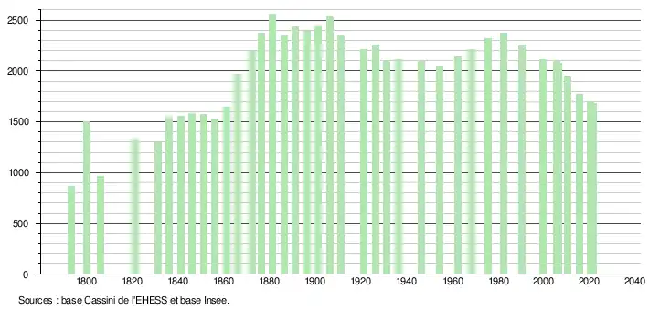 L'évolution du nombre d'habitants est connue à travers les recensements de la population effectués dans la commune depuis 1793. Pour les communes de moins de 10 000 habitants, une enquête de recensement portant sur toute la population est réalisée tous les cinq ans, les populations légales des années intermédiaires étant quant à elles estimées par interpolation ou extrapolation[16]. Pour la commune, le premier recensement exhaustif entrant dans le cadre du nouveau dispositif a été réalisé en 2005[17].