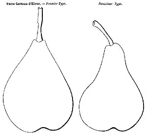 Les descriptions d'André Leroy et d'Alphonse Mas sont différentes. Ces deux spécialistes dessinent des silhouettes dissemblables du fruit. André Leroy en propose même deux versions.