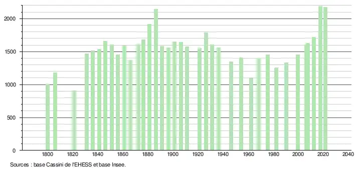 L'évolution du nombre d'habitants est connue à travers les recensements de la population effectués dans la commune depuis 1800. Pour les communes de moins de 10 000 habitants, une enquête de recensement portant sur toute la population est réalisée tous les cinq ans, les populations légales des années intermédiaires étant quant à elles estimées par interpolation ou extrapolation[10]. Pour la commune, le premier recensement exhaustif entrant dans le cadre du nouveau dispositif a été réalisé en 2007[11].