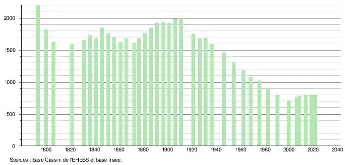 L'évolution du nombre d'habitants est connue à travers les recensements de la population effectués dans la commune depuis 1793. Pour les communes de moins de 10 000 habitants, une enquête de recensement portant sur toute la population est réalisée tous les cinq ans, les populations légales des années intermédiaires étant quant à elles estimées par interpolation ou extrapolation[29]. Pour la commune, le premier recensement exhaustif entrant dans le cadre du nouveau dispositif a été réalisé en 2008[30].