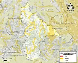 Le retrait-gonflement des sols argileux est susceptible d'engendrer des dommages importants aux bâtiments en cas d’alternance de périodes de sécheresse et de pluie[17]. 25 % de la superficie communale est en aléa moyen ou fort (27 % au niveau départemental et 48,5 % au niveau national métropolitain)[Carte 2]. Depuis le , en application de la loi ÉLAN, différentes contraintes s'imposent aux vendeurs, maîtres d'ouvrages ou constructeurs de biens situés dans une zone classée en aléa moyen ou fort[Note 4],[18].