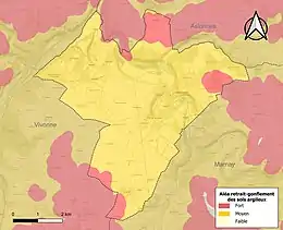 Les mouvements de terrains susceptibles de se produire sur la commune sont des affaissements et effondrements liés aux cavités souterraines (hors mines) et des tassements différentiels[19]. Afin de mieux appréhender le risque d’affaissement de terrain, un inventaire national permet de localiser les éventuelles cavités souterraines sur la commune[20]. Le retrait-gonflement des sols argileux est susceptible d'engendrer des dommages importants aux bâtiments en cas d’alternance de périodes de sécheresse et de pluie[21]. La totalité de la commune est en aléa moyen ou fort (79,5 % au niveau départemental et 48,5 % au niveau national)[Carte 2]. Depuis le , en application de la loi ÉLAN, différentes contraintes s'imposent aux vendeurs, maîtres d'ouvrages ou constructeurs de biens situés dans une zone classée en aléa moyen ou fort[Note 3],[22].