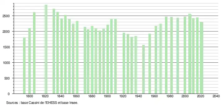 L'évolution du nombre d'habitants est connue à travers les recensements de la population effectués dans la commune depuis 1793. Pour les communes de moins de 10 000 habitants, une enquête de recensement portant sur toute la population est réalisée tous les cinq ans, les populations légales des années intermédiaires étant quant à elles estimées par interpolation ou extrapolation[34]. Pour la commune, le premier recensement exhaustif entrant dans le cadre du nouveau dispositif a été réalisé en 2005[35].